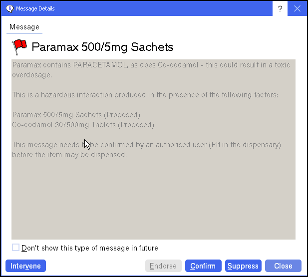Note: Pharmacy Manager will not report as drug doubling specific instances of duplication e.g. Warfarin 1mg tablets in combination with Warfarin 3mg tablets, prescribed in such a way as to achieve a desired dosage.