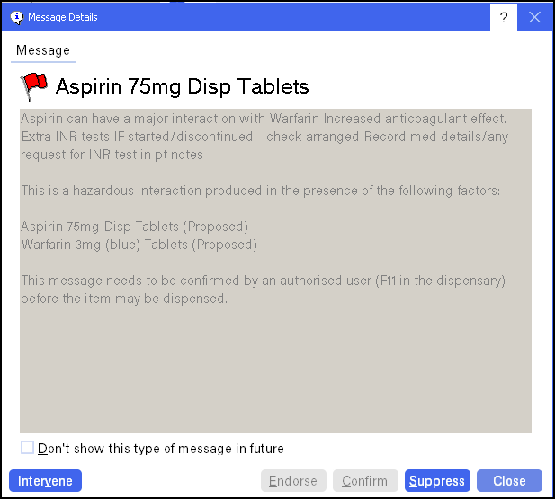 If you do not want to see the interaction again for that patient and that product, click the Suppress button.