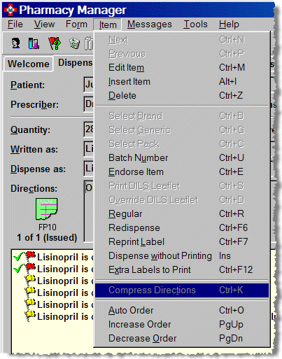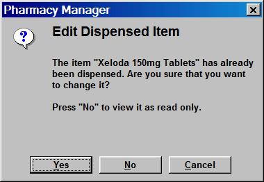 Click the YES button in order to edit the item e.g. to alter the dispensed quantity or to amend or append dosage and direction lines.