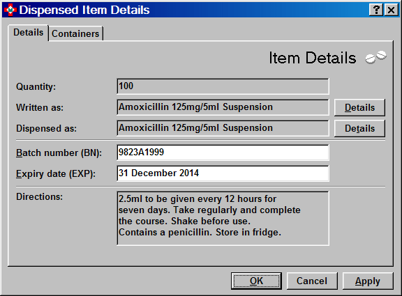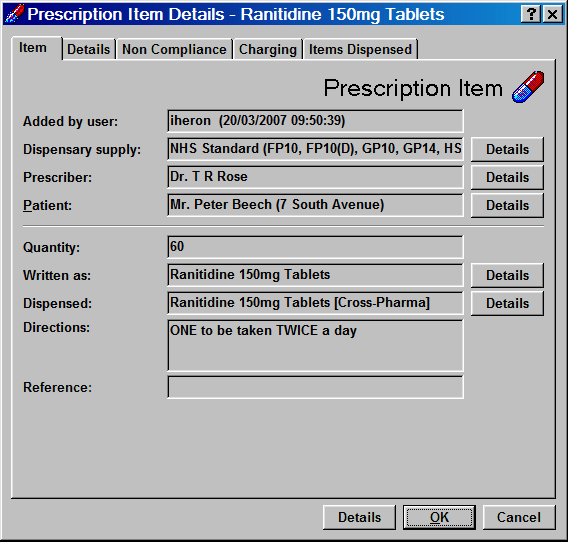 Prescription Item Details shows you all about that particular item on that particular prescription for that patient.