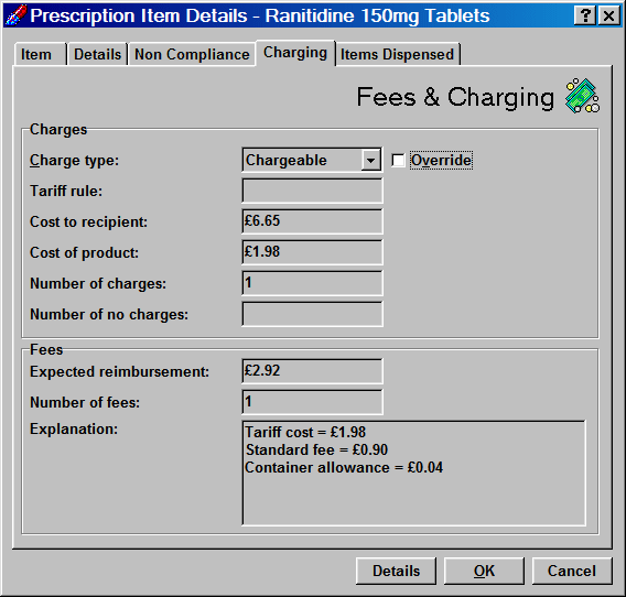 A common feature at the bottom of these tabs is the Details button which, when clicked, will provide more information about the dispensed item.