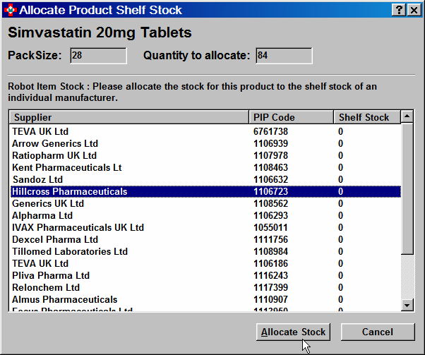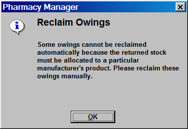 Where two or more manufacturers exist, Pharmacy Manager cannot know to which item's shelf stock it should allocate the reclaimed owing. In such an event, a list of possible options is displayed.