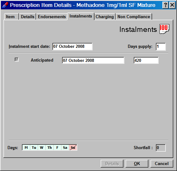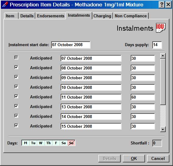 Pharmacy Manager will then split the quantity evenly over the number of day's supply, making any allowance for non-working days when it adjusts the instalment quantity for the preceding day.