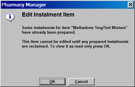 When you edit an instalment item that has already had some instalments prepared or collected, Pharmacy Manager will no longer allow you to edit the item. If you try, you will be presented with the following alert: