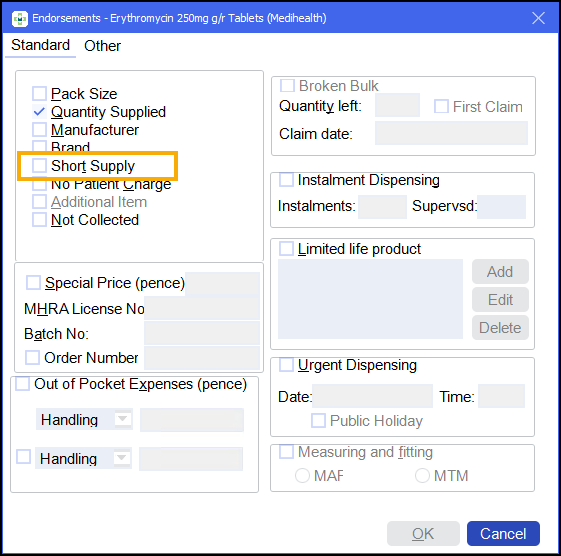If the Short supply/NCSO endorsement setting is enabled for such a product, Short Supply on the endorsements screen is enabled, but unchecked. Tick Short Supply and the relevant endorsement will be applied: