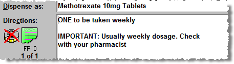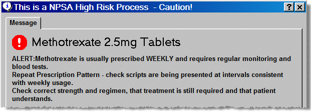 The National Patient Safety Agency (NPSA) have published a requirement aimed at reducing or removing harm associated with dosing errors with oral Methotrexate. Pharmacy Manager incorporates additional Methotrexate alerts in order to identify and prevent erroneous prescribing and supply.