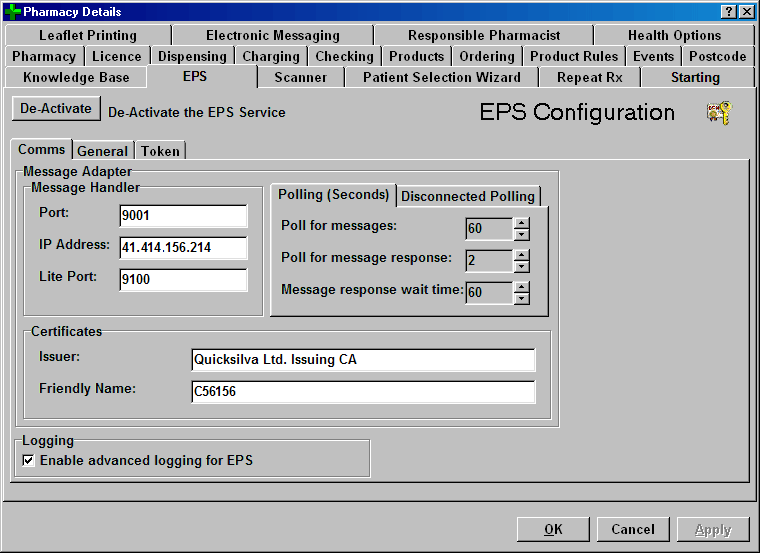 By default, should the communications be disconnected, Pharmacy Manager will try to reconnect every 15 seconds for the first 300 seconds (5 minutes) before entering the sleep mode period. If the communications do not reconnect after that period of time, Pharmacy Manager will then only poll once every 600 seconds (10 minutes) whilst it is sleep mode.