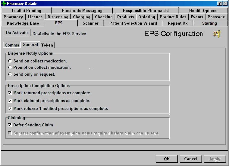 These settings allow the pharmacist to determine when, after dispensing a prescription, the dispense notification is sent to the CRS.