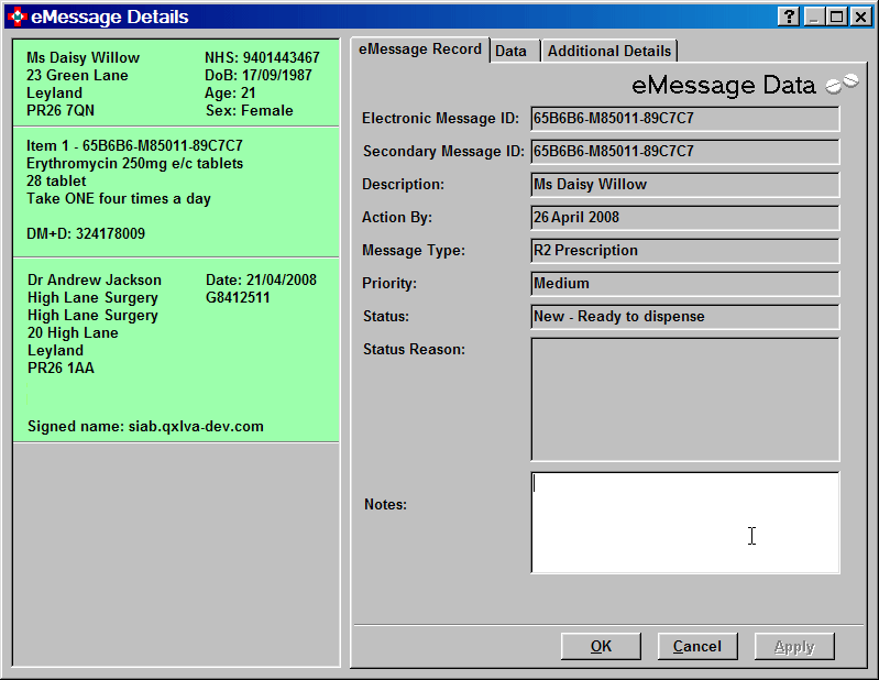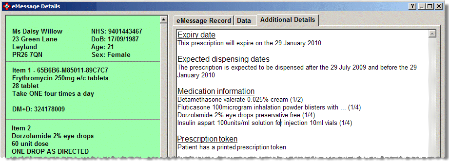 The eMessage Record tab appears. A representation of the electronic prescription including all the patient, prescriber and medication item details that you would normally see on a printed prescription token. This representation is similar to what you will see during prescription processing through the patient selection wizard and onward.