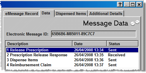 The eMessages tab provides access to much detail related to each electronic message - effectively a message will start as an incoming prescription which then produces a linked series of subsequent messages until, typically, the reimbursement claim is successfully acknowledged by the spine.