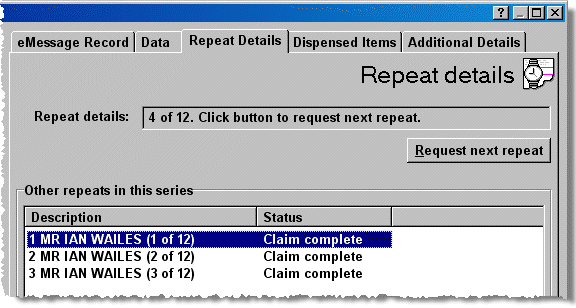 Click the Repeat Details tab. In the illustration above, 3 of 12 has been dispensed so the next repeat to request would be 4 of 12.