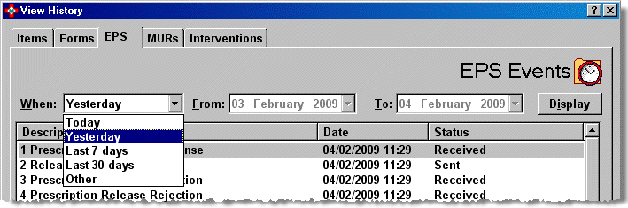 Each of the messages you have sent and received will be listed on the EPS events screen. Initially the list will show only the messages sent and received today. You can filter the list of messages as you require.