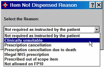 Prescription cancellation should not be used as a not dispensed reason apart from when a prescription has been marked as cancelled by the prescriber and he/she has informed you when you have already downloaded the prescription.