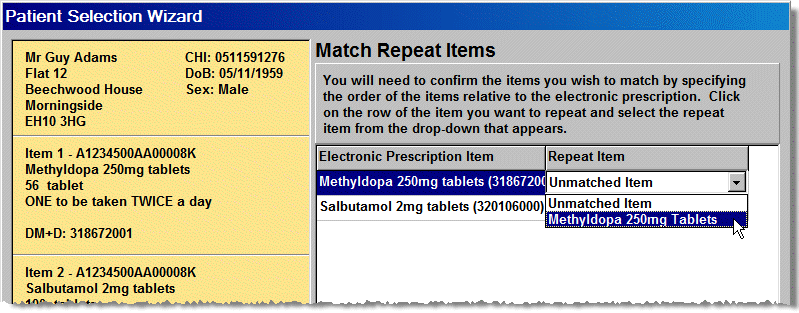 Items that have previously been prescribed against the particular DM+D code in the electronic prescription will be automatically matched.