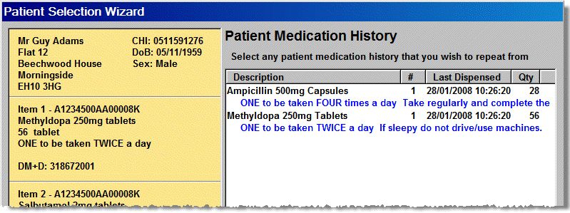 Electronic prescriptions have the advantage of being quickly processed in Pharmacy Manager. The repeat process outlined above can further speed up dispensing and labelling which may suit your pharmacy workflow. However, if you prefer, and option exists for you to suppress the medication history display step (which in turn disables repeating for eAMS prescriptions) in the Patient selection wizard.