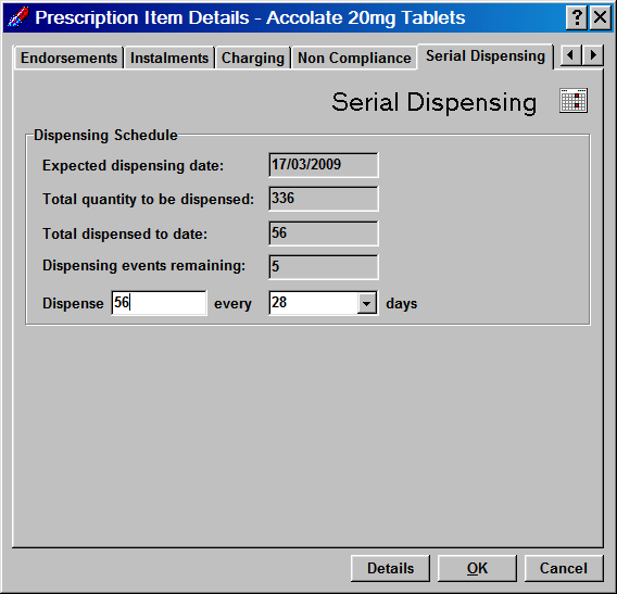 The dispense quantity and frequency can be altered with care. If the dispensed value was halved to 28 and the frequency was increased to 14 days, click the OK button to save and exit.