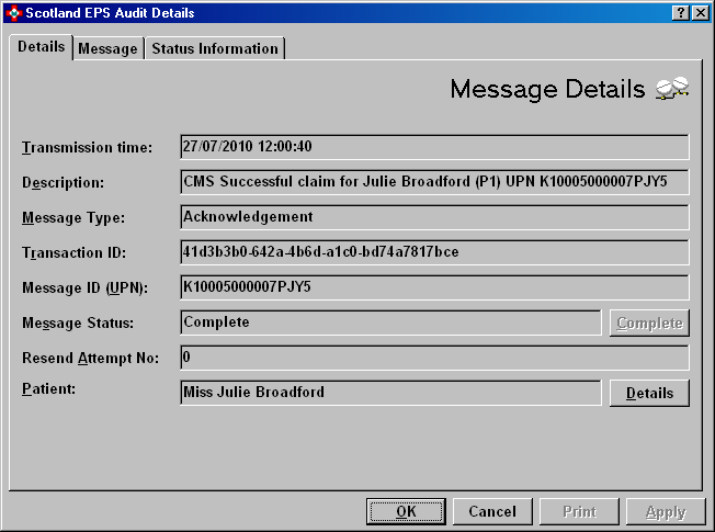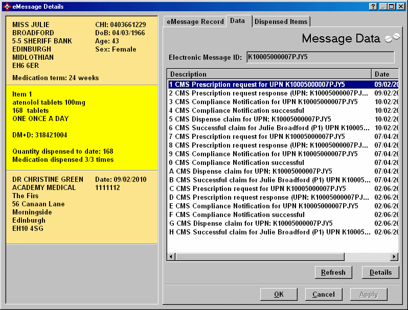 The Data tab provides a list of messages, relating to this serial prescription, that have been sent to and from the ePMS. These may only be useful for technical support issues.