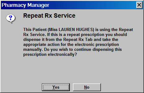 Click the Yes button to continue dispensing the prescription outside the scope of Repeat Rx