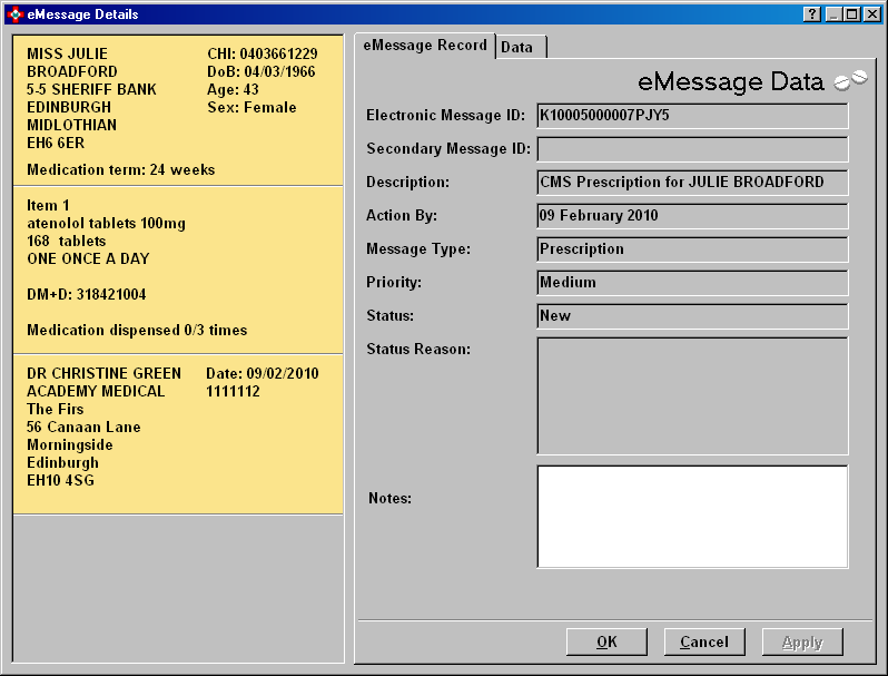 The eMessage record tab provides a graphical representation of the prescription with other identifying information.