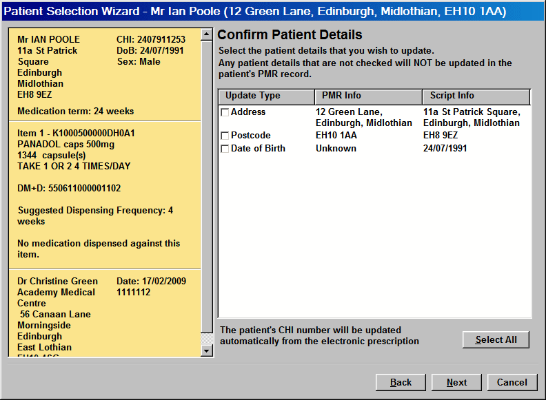 The process uses the patient’s unique CHI number as the identifier for “matching”. Additionally, the green tick confirms the match. In this example, it is clear from the name and address that the patient in the PMR is the same patient on the prescription.