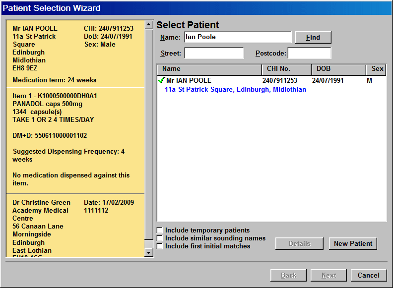 The first stage of the Patient Selection Wizard displays the only possible match on the right hand side of the display and a mock-up of the electronic prescription on the left of the display.
