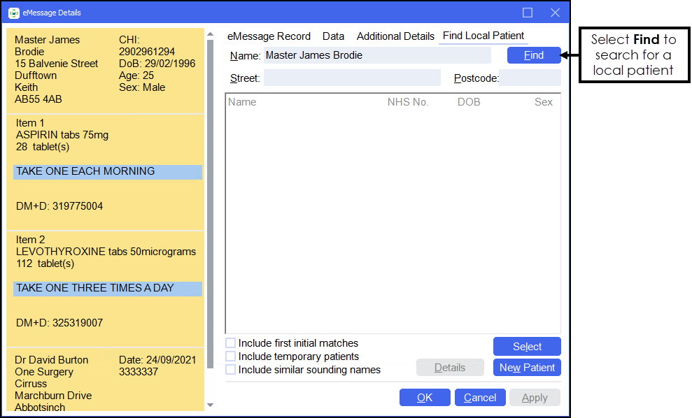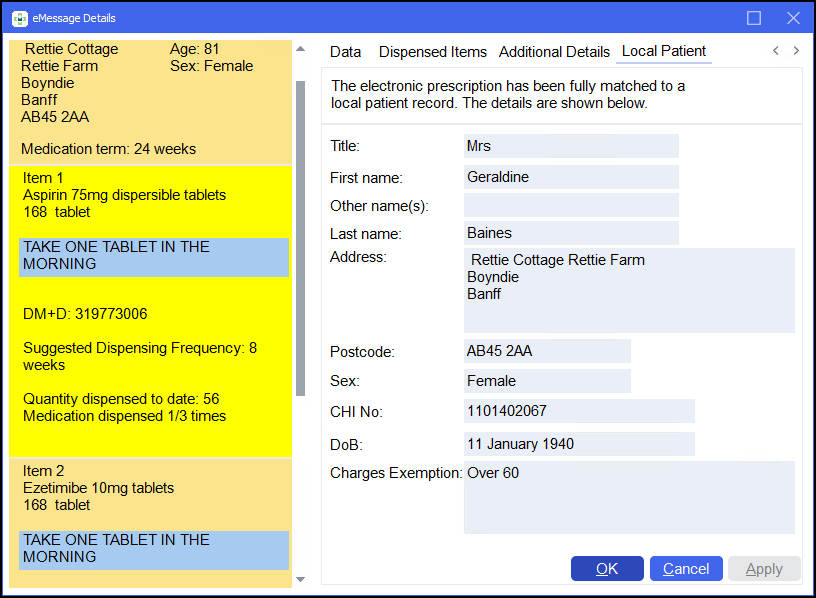 If the prescription is fully matched to an existing local patient record then the patient details display as above.