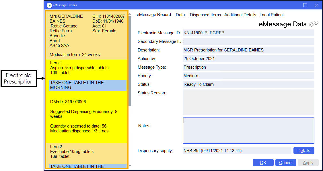 The eMessage Details screen displays all the details relating to an electronic prescription.