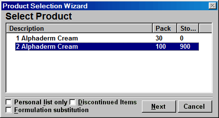 If there is more than one choice e.g. packs sizes of a brand or generic, the Product selection wizard will appear.