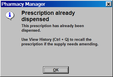 Similarly, if you scan a prescription that has already been dispensed, the following alert appears: