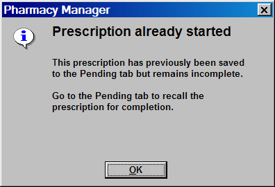 On the Dispensarytab, if you scan a prescription that has already been started i.e. it is saved to the Pending tab, the following alert appears: