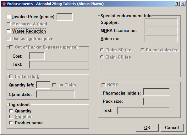 Endorsements that are not applicable to the dispensed item are disabled (greyed out) so they cannot be completed.