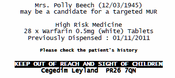 If so, and subject to your configuration, a prompt label will be printed giving the reason for the potential MUR, its target category, and the medication(s) involved. This is ideal if the patient is not present to collect their medication.