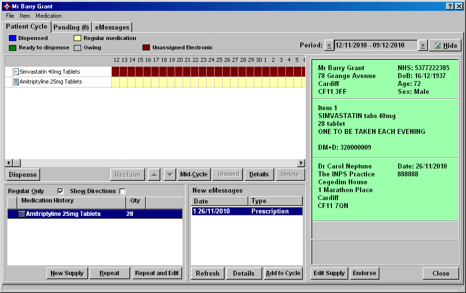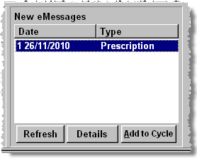 Click the Refresh button to check for any further prescription eMessages that may have been delivered for this patient since you opened the Patient cycle display. It will also remove any that have added to the cycle.