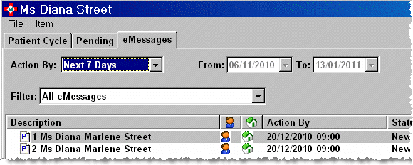Click on the eMessages tab to display a filtered view of items limited to the selected patient.