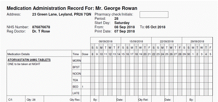 The format printed will reflect your MAR chart selection for the chosen address e.g. Cegedim RX own enhanced A4 landscape (see above) or Custom MAR charts in Scotland