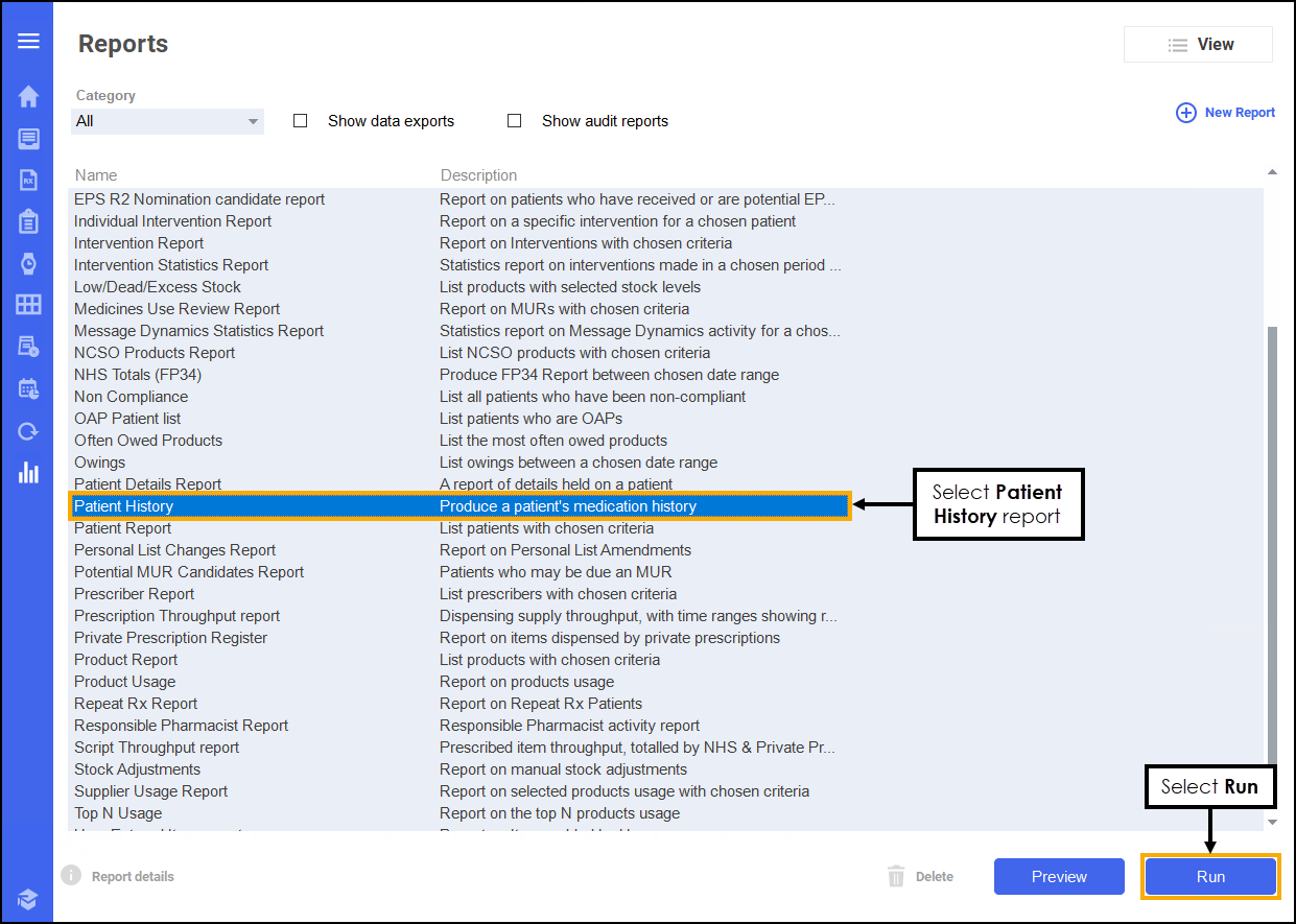 From the list of reports, select Patient History and then select Run: