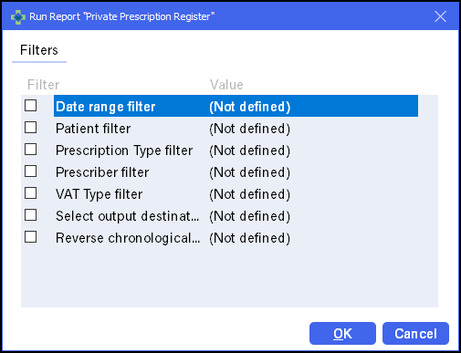 , select the Private Prescription Register report. - If required, double click to display Filters, tick and complete as appropriate: