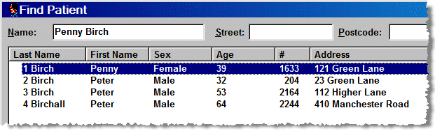 There are several ways of finding a patient whose details have already been entered into Pharmacy Manager. Type any of the following into the Patient box to find a patient: