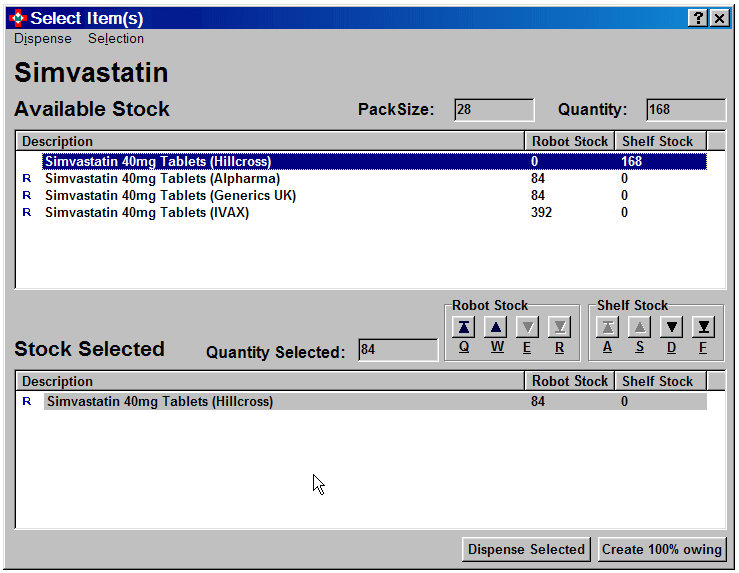 Handle the first option by simply moving the highlighted bar to the chosen item. Click the Dispense Selected button or press the key. The system reverts to the Dispensary tab allowing you to continue labelling.