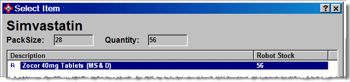 When the Written as item is selected e.g. Simvastatin 40mg tablets, the following display will appear: