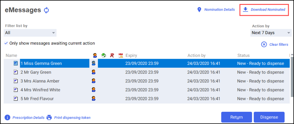 - The Nominated Prescription Download screen displays: