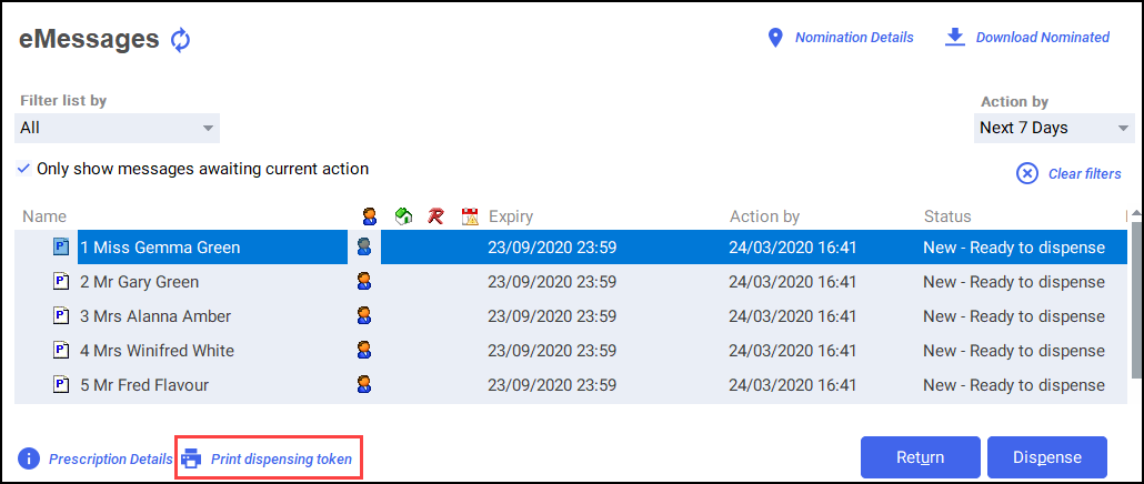 Note - To print a dispensing token for a patient that has multiple prescriptions to be dispensed: Sort by name, hold CTRL and select each prescription, select Print dispensing token.