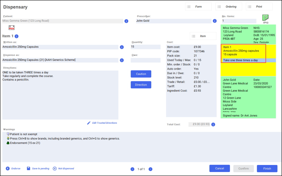 - Dispense as - Populates automatically with the dispensed item, for example, Amoxicillin 200mg Capsules 21 AAH Generics Scheme.