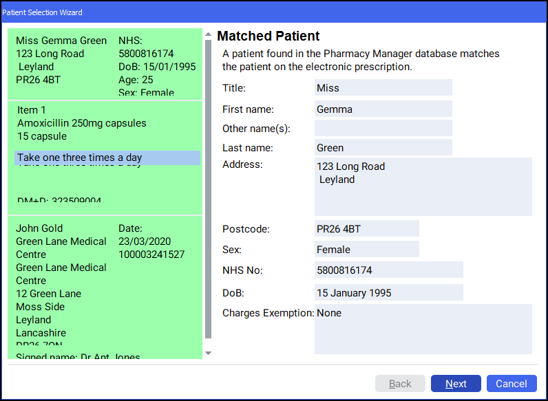Note - At this point, users in Scotland will see the Prescriber Notes screen, if any notes from the prescriber exist on the prescription. - The Patient Selection Wizard displays. This confirms that the patient is matched to an existing Pharmacy Manager patient:
