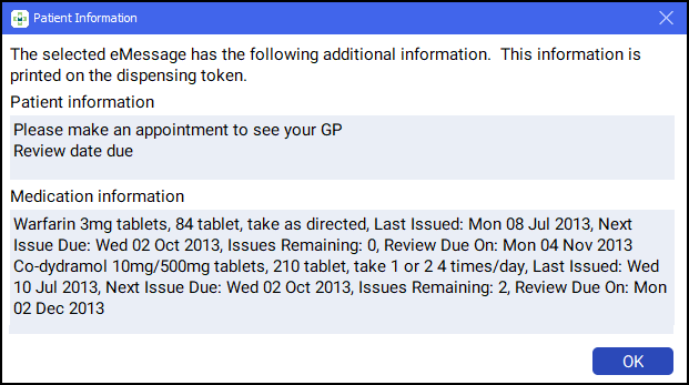 - The Patient Information screen displays, showing any notes added by the GP. Select OK