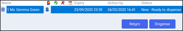 . The Dispensary screen displays with the patient, prescriber and number of items pre-populated from the electronic prescription:
