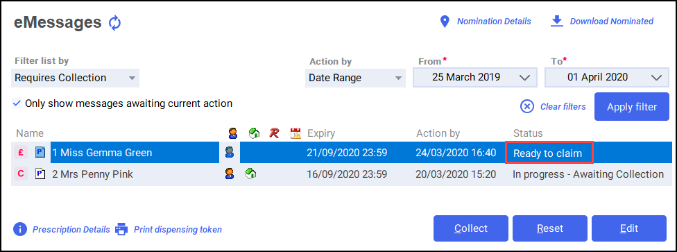 Training Tip - To mark multiple prescriptions as collected, hold CTRL, select each prescription and select Collect. - The status of the prescription changes to Ready to Claim: