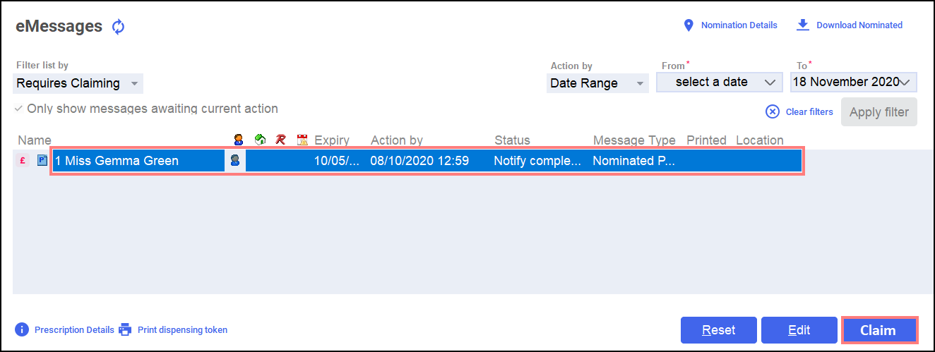 Training Tip - To claim for multiple prescriptions, hold CTRL, select each prescription and select Claim. - The claimed prescription clears from the screen and is sent to the NHS BSA.