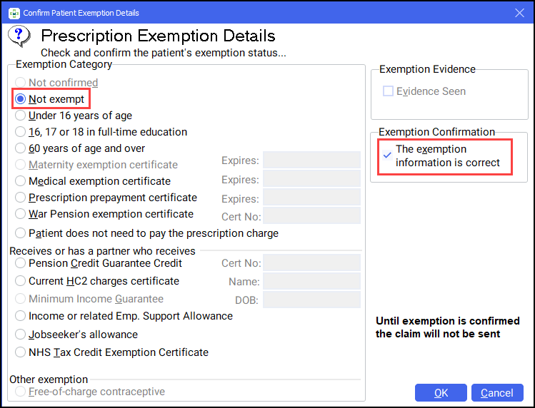 - Select the patient's exemption and tick the box to confirm that the exemption is correct and select OK.