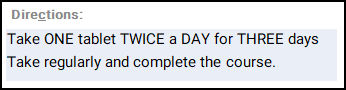 - Enter the appropriate Directions, for example, Take one tablet TWICE a DAY for THREE days.